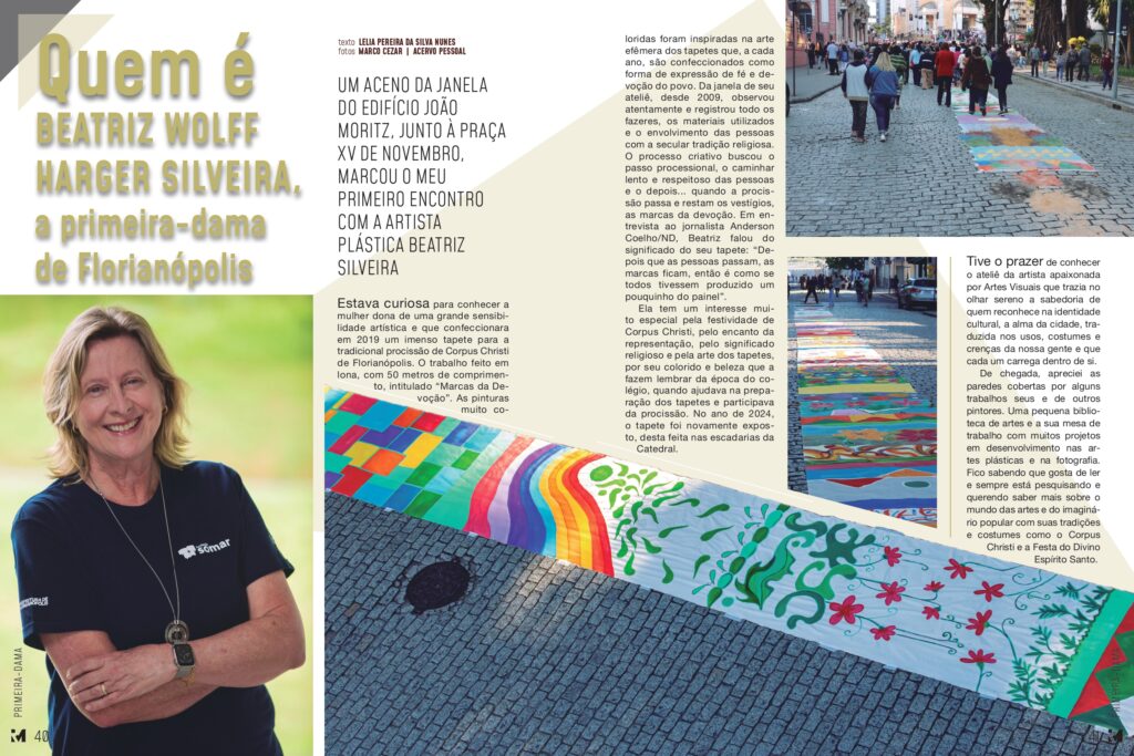 Estava curiosa para conhecer a mulher dona de uma grande sensibilidade artística e que confeccionara em 2019 um imenso tapete para a tradicional procissão de Corpus Christi de Florianópolis. O trabalho feito em lona, com 50 metros de comprimento, intitulado “Marcas da Devoção”. As pinturas muito coloridas foram inspiradas na arte efêmera dos tapetes que, a cada ano, são confeccionados como forma de expressão de fé e devoção do povo. Da janela de seu ateliê, desde 2009, observou atentamente e registrou todo os fazeres, os materiais utilizados e o envolvimento das pessoas com a secular tradição religiosa. O processo criativo buscou o passo processional, o caminhar lento e respeitoso das pessoas e o depois… quando a procissão passa e restam os vestígios, as marcas da devoção. Em entrevista ao jornalista Anderson Coelho/ND, Beatriz falou do significado do seu tapete: “Depois que as pessoas passam, as marcas ficam, então é como se todos tivessem produzido um pouquinho do painel”.