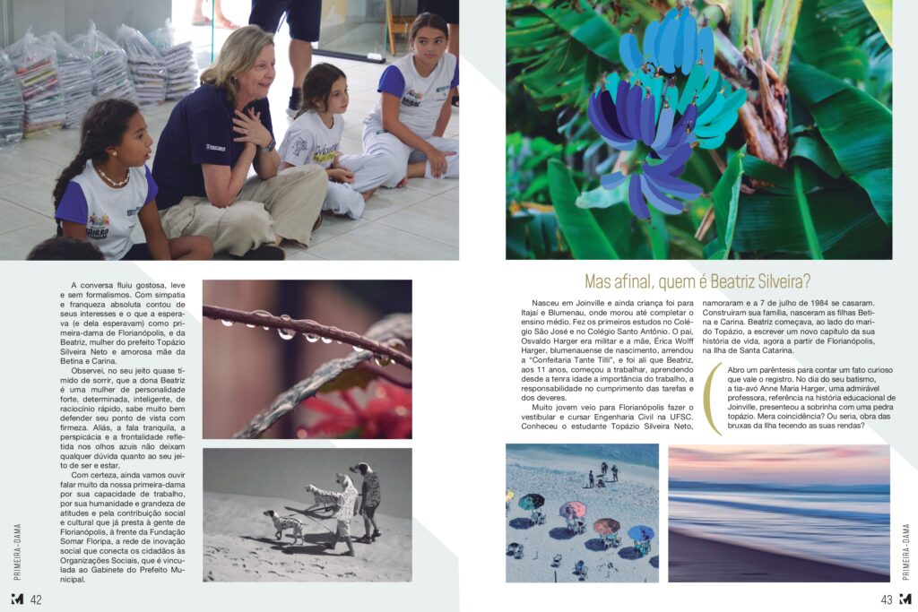 Com certeza, ainda vamos ouvir falar muito da nossa primeira-dama por sua capacidade de trabalho, por sua humanidade e grandeza de atitudes e pela contribuição social e cultural que já presta à gente de Florianópolis, à frente da Fundação Somar Floripa, a rede de inovação social que conecta os cidadãos às Organizações Sociais, que é vinculada ao Gabinete do Prefeito Municipal.