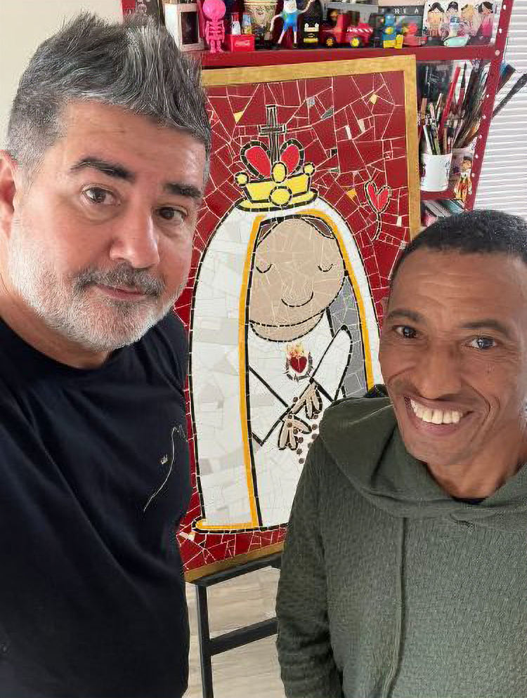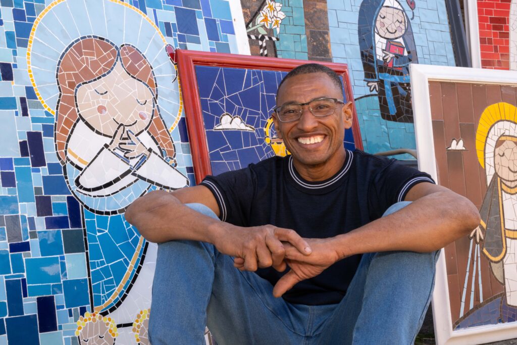 (Foto de abertura: Mestre Baleia em seu ateliê, entre os mosaicos que apresentam releituras de obras do artista plástico Luciano Martins | Foto: Marco Cezar)