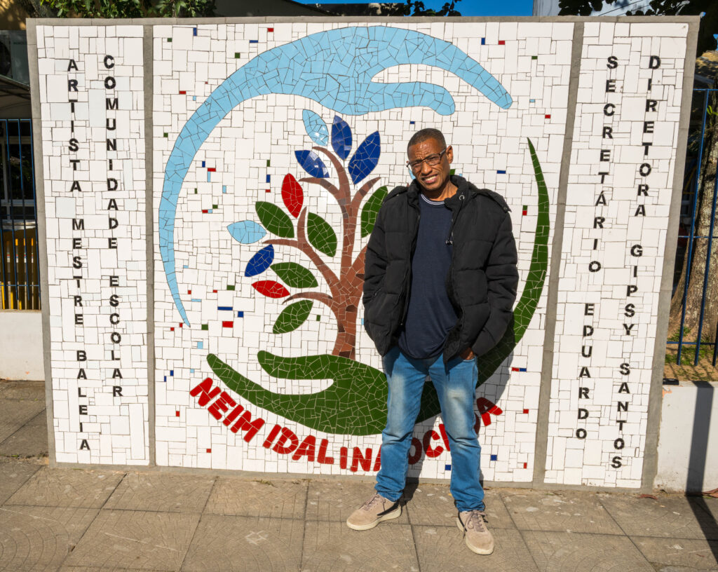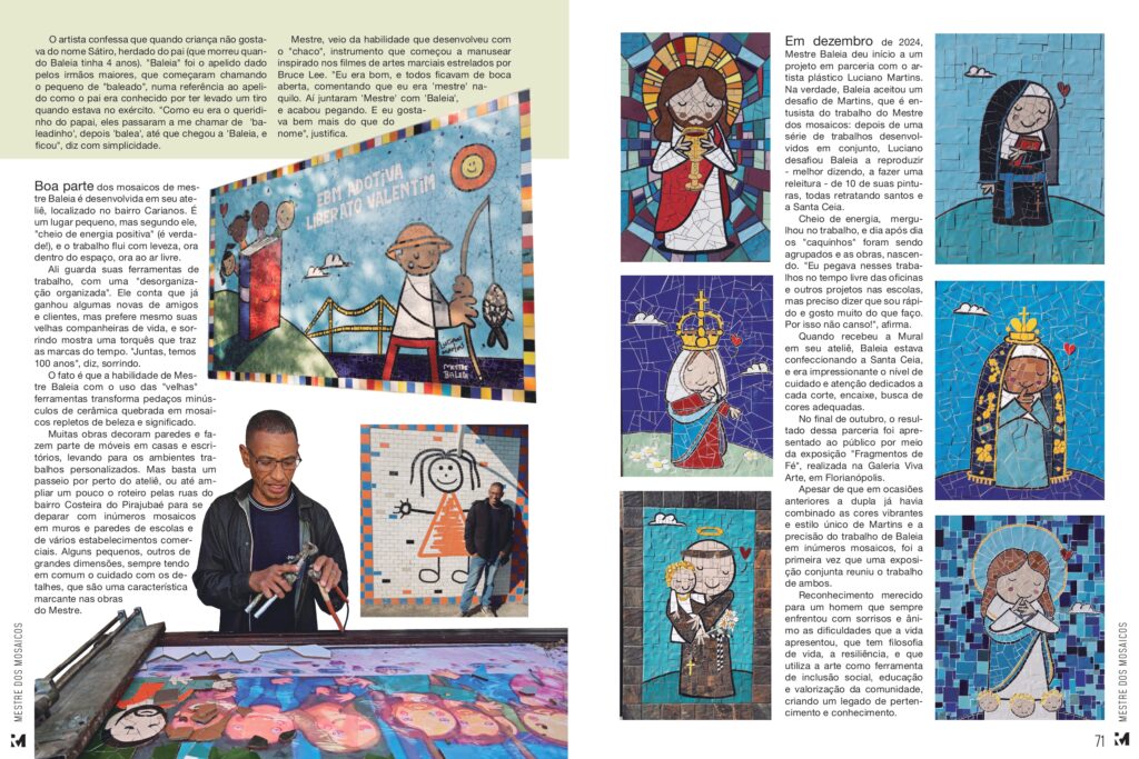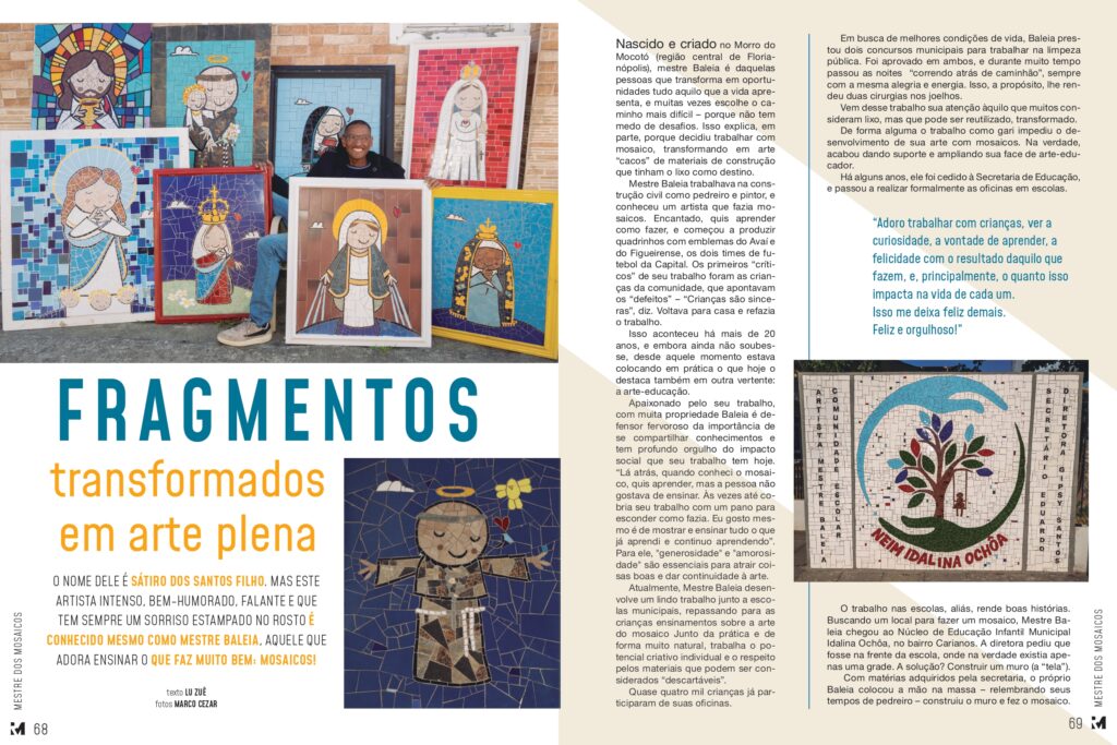 Nascido e criado no Morro do Mocotó (região central de Florianópolis), mestre Baleia é daquelas pessoas que transforma em oportunidades tudo aquilo que a vida apresenta, e muitas vezes escolhe o caminho mais difícil – porque não tem medo de desafios. Isso explica, em parte, porque decidiu trabalhar com mosaico, transformando em arte “cacos” de materiais de construção que tinham o lixo como destino.