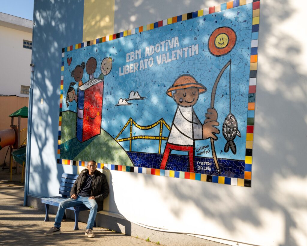 O trabalho nas escolas, aliás, rende boas histórias. Buscando um local para fazer um mosaico, Mestre Baleia chegou ao Núcleo de Educação Infantil Municipal Idalina Ochôa, no bairro Carianos. A diretora pediu que fosse na frente da escola, onde na verdade existia apenas uma grade. A solução? Construir um muro (a “tela”).