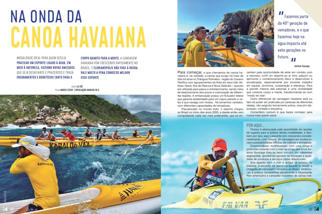 Modalidade ideal para quem deseja praticar um esporte ligado à água, em meio à natureza, fazendo novas amizades, que seja desafiante e prazeroso e traga ensinamentos e benefícios tanto para o corpo quanto para a mente, a canoagem havaiana vem crescendo rapidamente no Brasil, e Florianópolis não foge à regra. Vale muito a pena conhecer melhor esse esporte