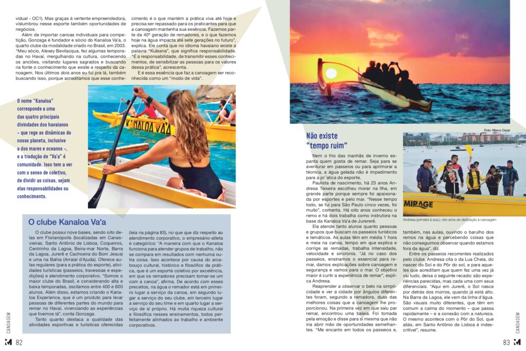 Além de importar canoas individuais para competição, Gonzaga é fundador e sócio do Kanaloa Va’a, o quarto clube da modalidade criado no Brasil, em 2003. “Meu sócio, Alexey Bevilacqua, fez algumas temporadas no Havaí, mergulhando na cultura, conhecendo os anciões, visitando lugares sagrados e buscando na fonte o conhecimento que existe a respeito da canoagem. Nos últimos dois anos eu fui pra lá, também buscando isso, porque acreditamos que esse conhecimento é o que mantém a prática viva até hoje e precisa ser repassado para os praticantes para que a canoagem mantenha sua essência. Fazemos parte da 40ª geração de remadores, e o que fazemos hoje na água impacta até sete gerações no futuro”, explica. Ele conta que no idioma havaiano existe a palavra “Kuleana”, que significa responsabilidade. “É a responsabilidade, de transmitir esses conhecimentos, de sensibilizar as pessoas para os valores dessa prática”, acrescenta.