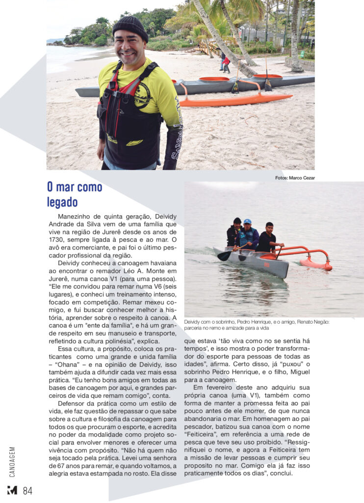 Deividy conheceu a canoagem havaiana ao encontrar o remador Léo A. Monte em Jurerê, numa canoa V1 (para uma pessoa). “Ele me convidou para remar numa V6 (seis lugares), e conheci um treinamento intenso, focado em competição. Remar mexeu comigo, e fui buscar conhecer melhor a história, aprender sobre o respeito à canoa. A canoa é um “ente da família”, e há um grande respeito em seu manuseio e transporte, refletindo a cultura polinésia”, explica.