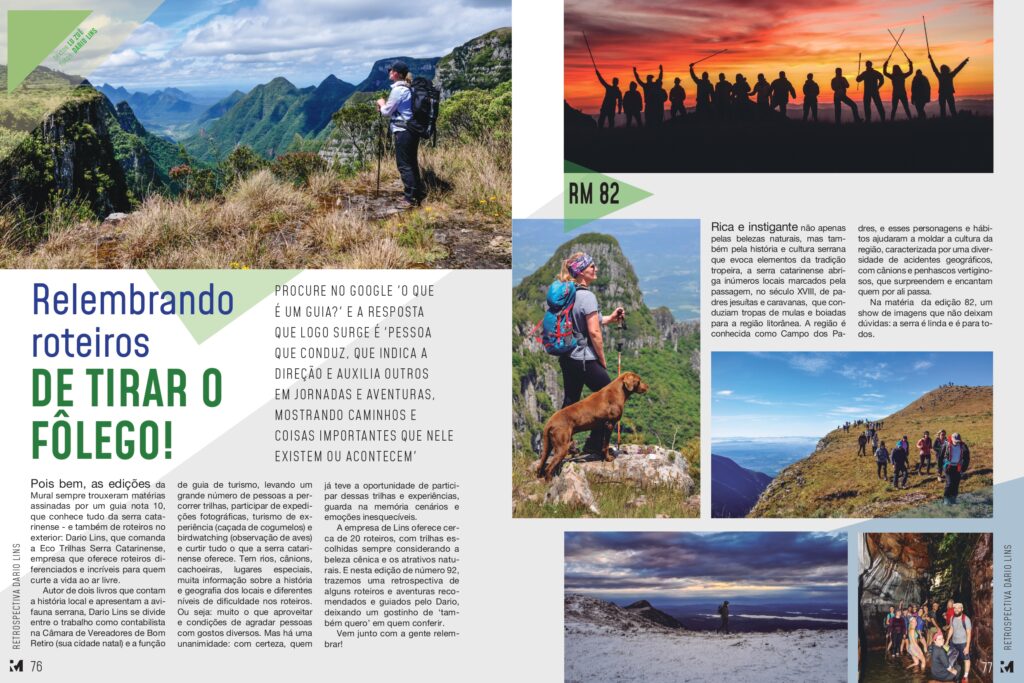 Pois bem, as edições da Mural sempre trouxeram matérias assinadas por um guia nota 10, que conhece tudo da serra catarinense – e também de roteiros no exterior: Dario Lins, que comanda a Eco Trilhas Serra Catarinense, empresa que oferece roteiros diferenciados e incríveis para quem curte a vida ao ar livre.