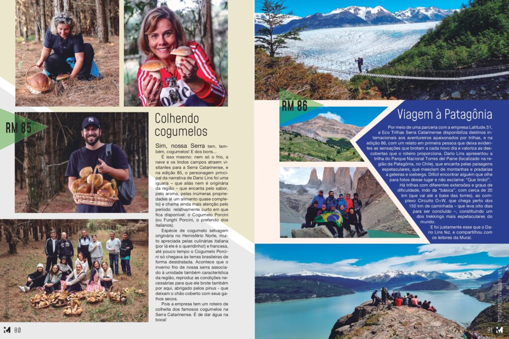 Por meio de uma parceria com a empresa Latitude.51, a Eco Trilhas Serra Catarinense disponibiliza destinos internacionais aos aventureiros apaixonados por trilhas, e na edição 86, com um relato em primeira pessoa que deixa evidentes as sensações que brotam a cada novo dia e valoriza as descobertas que o roteiro proporciona, Dario Lins apresentou a trilha do Parque Nacional Torres del Paine (localizado na região da Patagônia, no Chile), que encanta pelas paisagens espetaculares, que mesclam de montanhas e pradarias a geleiras e icebergs. Difícil encontrar alguém que olhe para fotos desse lugar e não exclame: “Que lindo!”.